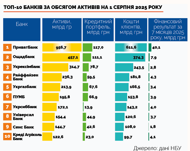 Водночас ринок залишається висококонцентрованим із домінуванням державних банків. Серед десятьох найбільших фінустанов за розміром активів п’ять є держбанками, частка яких на ринку станом на початок серпня 2025 року сягала 54%. Втім, у 2026-му картина може змінитися, оскільки Кабмін та НБУ знову заговорили про плани щодо продажу державних банків.