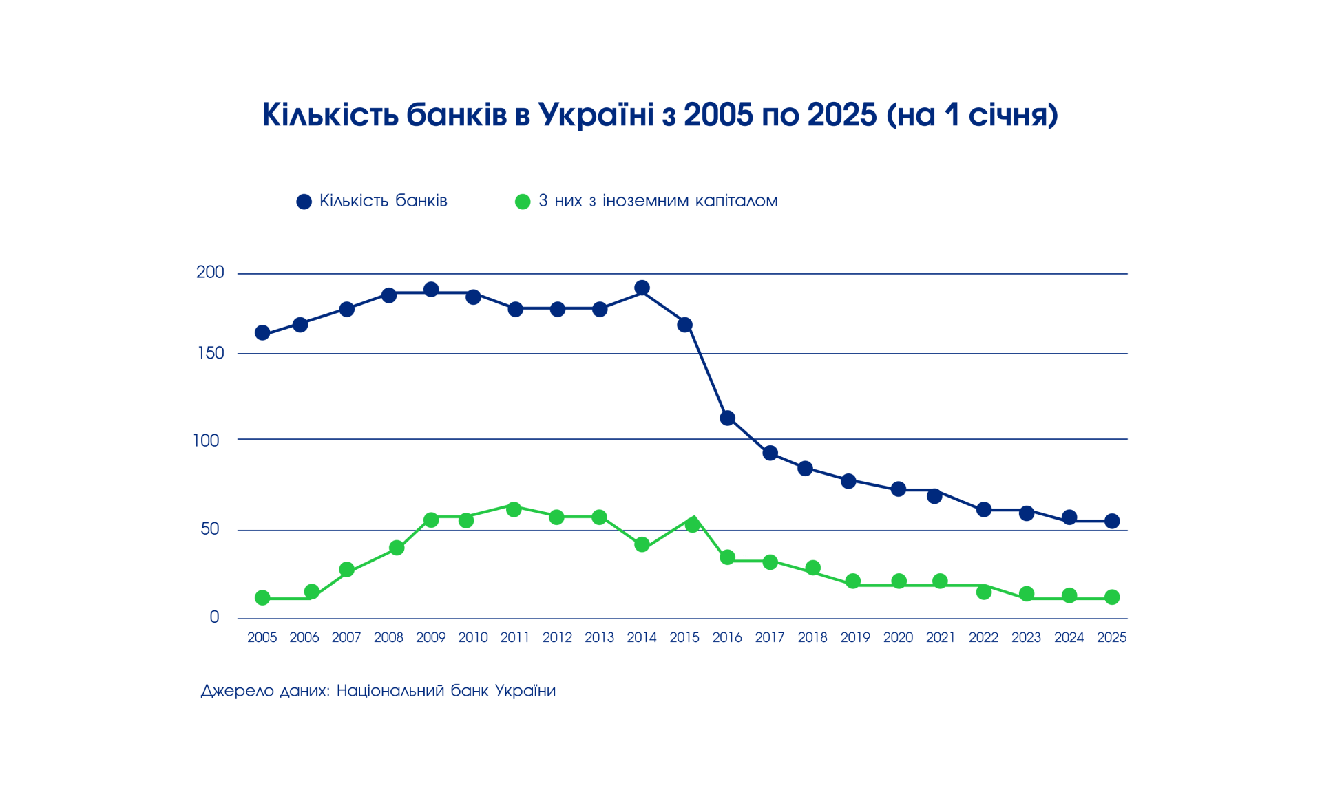 Протягом 2014 — 2016 років з ринку виводяться понад 80 банків: якщо станом на січень 2014-го їх було 180, то «під ялинку» 2017-го їх залишилось лише 96. Відтоді і понині кількість банків в Україні повільно, але впевнено зменшується.