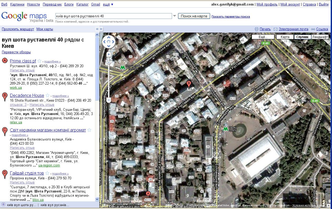 Кроме того, украинский сервис, как ожидалось, должен бы сопровождаться и украинским языком, однако этого нет, все описание, кнопки и названия объектов на карте выполнены на русском языке. Впрочем, ввод название улицы и города на украинском языке не смущает Googlе, и нужный адрес система находит безошибочно. Помимо этого, пользователю предлагается список объектов, расположенных рядом с интересующим адресом, таких, как магазины, рестораны, места отдыха, музеи и т.д.
