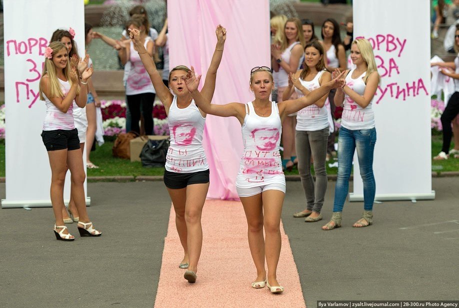 А в минувшую пятницу на Пушкинской площади на акцию "Порву за Путина", организованную другим сообществом в социальной сети ВКонтакте "Армия Путина", пришли 25 девушек, одетых в белые майки с розовой фотографией премьера. Организаторы акции призвали девушек снимать ролики, демонстрирующие, как кандидатка "кого-то или что-то рвет за Путина". Победительнице обещают вручить планшетный компьютер iPad2.