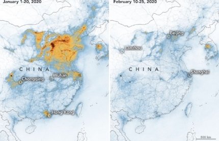 На спутниковых снимках видно падение уровня диоксида азота (NO2) — ядовитого газа, выделяемого транспортными средствами, электростанциями и промышленными объектами.