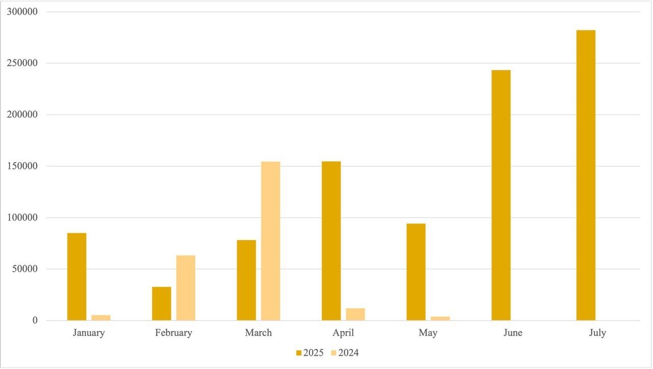 Експорт електроенергії помісячно, за 2024 та 2025 роки, МВт-год