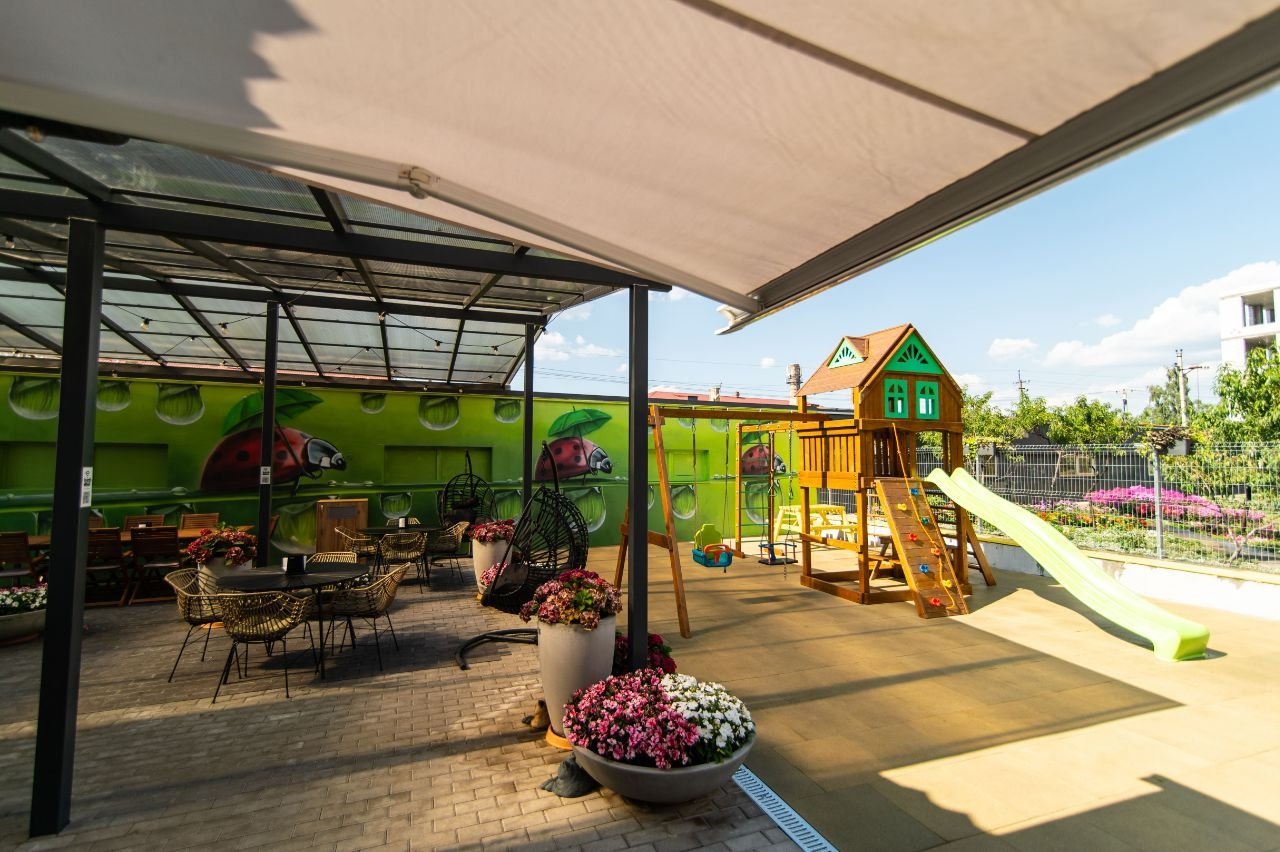 Особливість його в тому, що це мікс форматів. DRIVE – для тих, хто хоче отримати своє замовлення за кілька хвилин не виходячи з авто, щоб потім смачно й безпечно перекусити в дорозі або вдома. Сімейний заклад – для гостей, яким треба перепочити й насолодитися улюбленими стравами або ж весело провести час із друзями чи дітьми. Для цього Döner Маркет обладнаний літньою терасою з дитячим майданчиком, а меню розширене – крім класичних донерів і шаурми є піца, бургери, а також позиції для дітей.