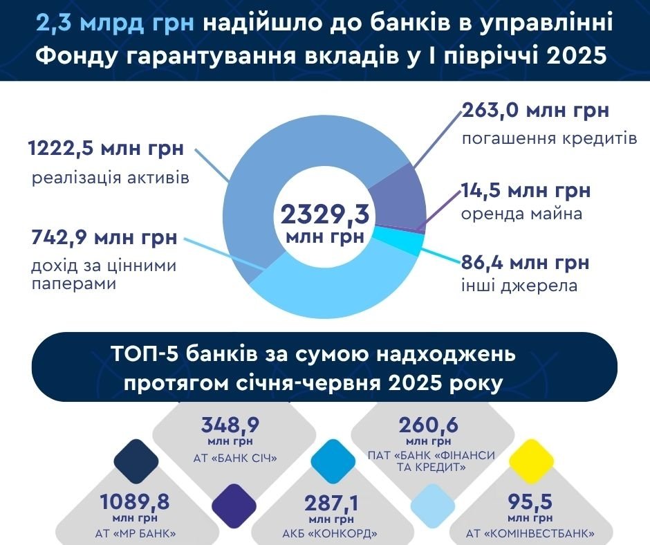 За перші шість місяців 2025 року до банків, що ліквідуються Фондом гарантування вкладів фізичних осіб (ФГВФО), надійшло понад 2,3 млрд гривень. З цих коштів 1,2 млрд грн банки-банкрути отримали від реалізації активів.