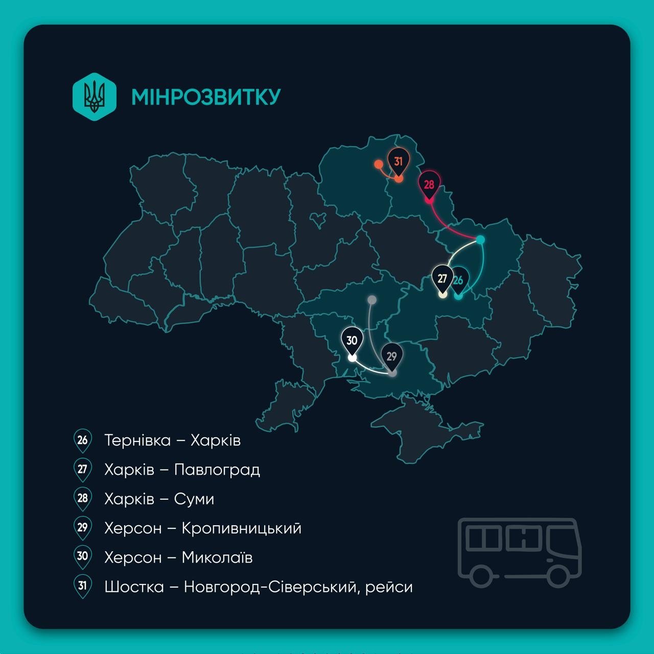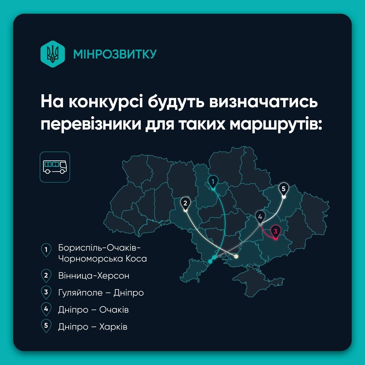 На конкурсі буде визначено перевізників для 31 маршрута, що є критично важливими для відновлення логістики та соціальної сфери у постраждалих областях.