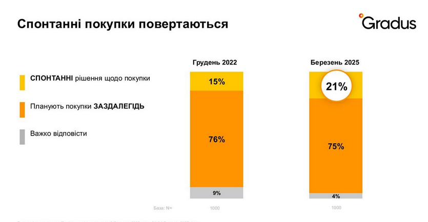 Спонтанні покупки повертаються. Якщо на початку повномасштабного вторгнення цей тренд майже зник, то у 2025 році частка імпульсивних покупок зросла до 21%. Цей показник ще вищий серед молоді.