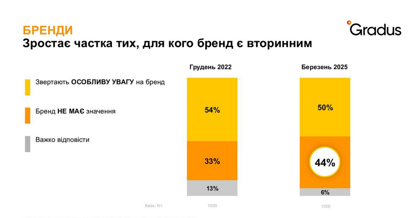 Згідно з опитуванням, у березні 2025 року частка тих, хто не звертає уваги на бренд, зросла до 44% (порівняно з 33% у грудні 2022 року). Це свідчить про те, що для багатьох українців ціна стає важливішим фактором, ніж бренд. Ця тенденція особливо помітна у невеликих населених пунктах.