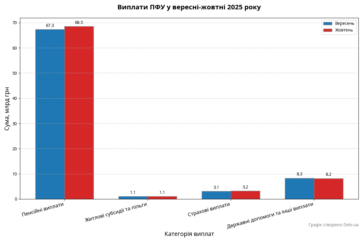 Пенсійний фонд України відзвітував про повне фінансування пенсійних виплат за жовтень 2025 року. На пенсійні виплати спрямовано 68,5 млрд гривень. Це на один мільярд двісті мільйонів гривень більше, ніж у вересні (67,3 млрд грн).