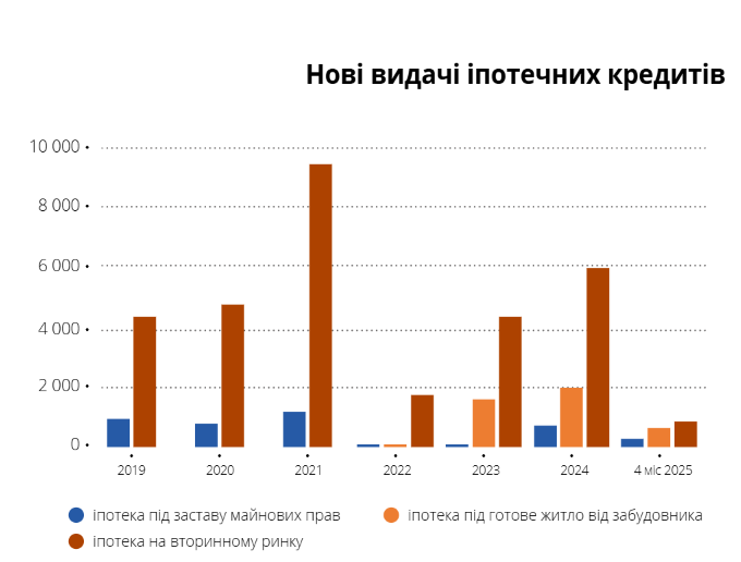 За її словами, у 2025 році натомість зростає кількість іпотеки під заставу майнових прав - на 82%, показники видачі іпотеки під готове житло від забудовників не змінились.