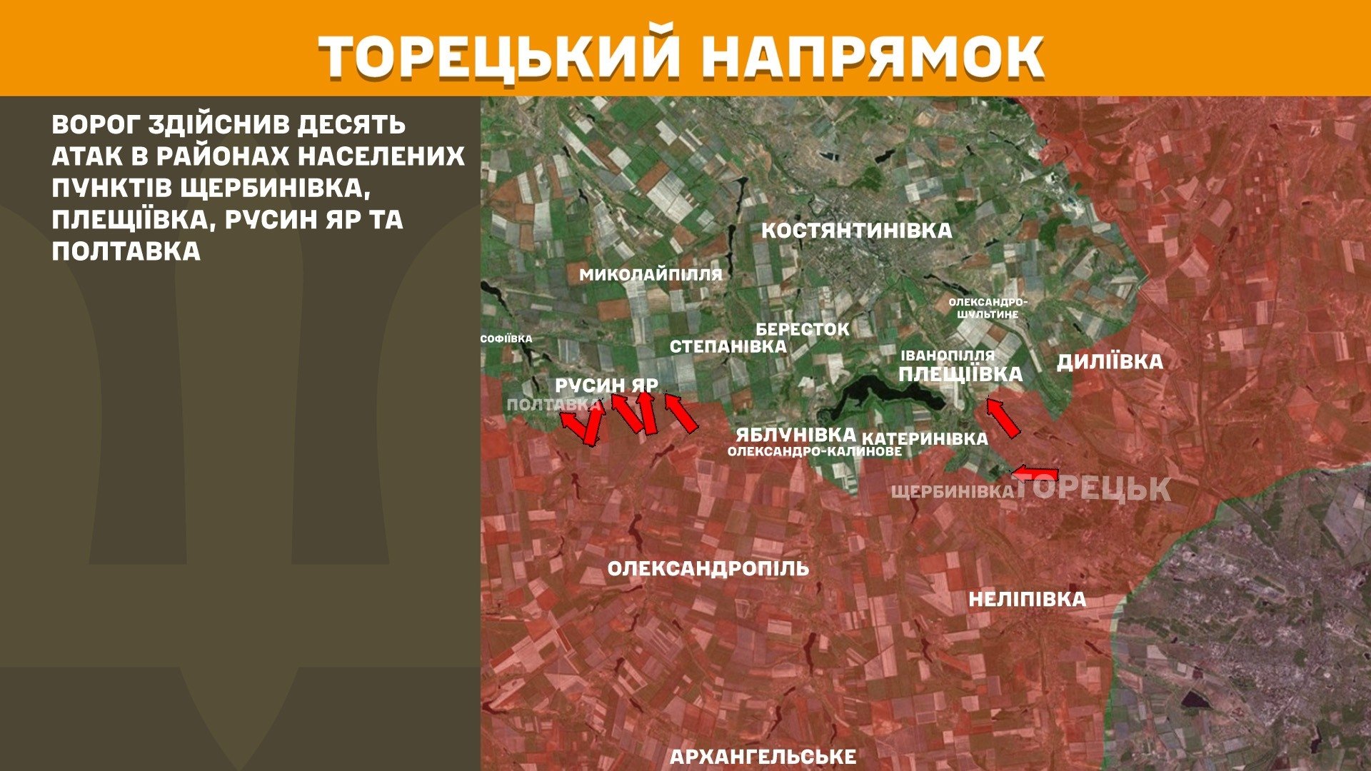 На Торецькому напрямку ворог здійснив десять атак в районах населених пунктів Щербинівка, Плещіївка, Русин Яр та Полтавка.