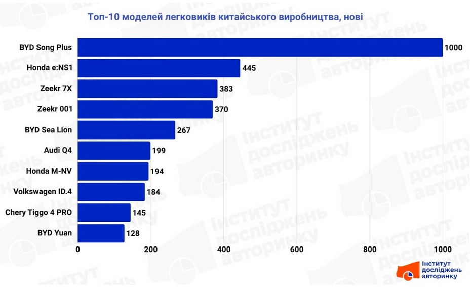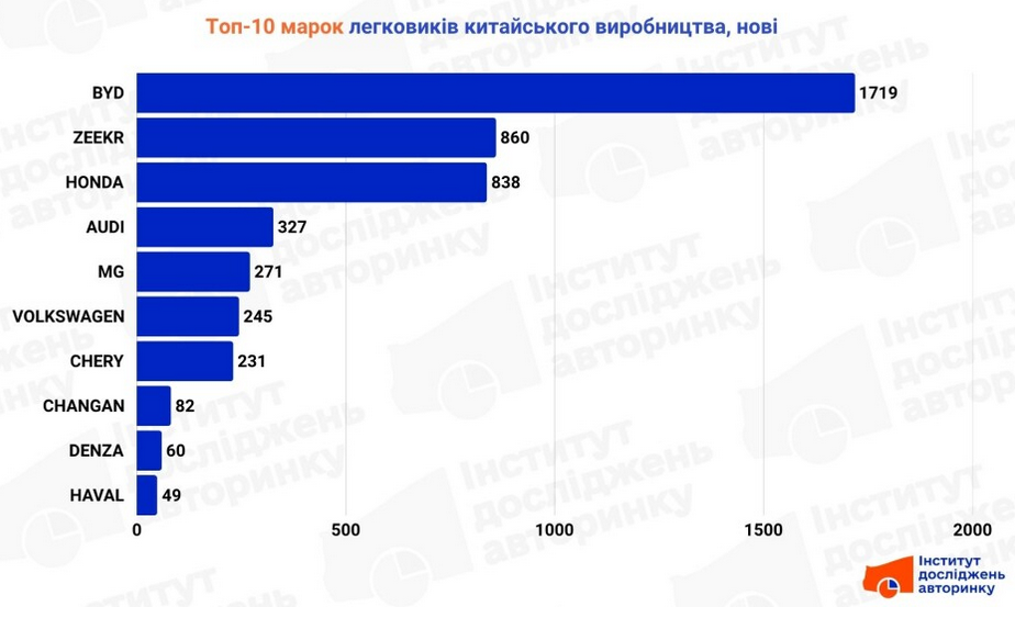 Абсолютним лідером стала марка китайського автогіганта з Шеньчжені BYD — 1719 зареєстрованих машин. Далі — Zeekr (860 шт.) і Honda (838 шт.), яка хоч і японська за походженням, активно збирає окремі моделі в Китаї. У десятці також Audi, MG, Volkswagen, Chery, Changan, Denza та Haval. Усі ці бренди мають власне виробництво або тісну співпрацю з місцевими підприємствами.