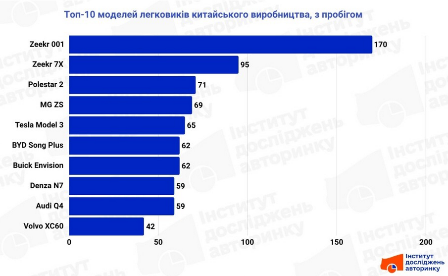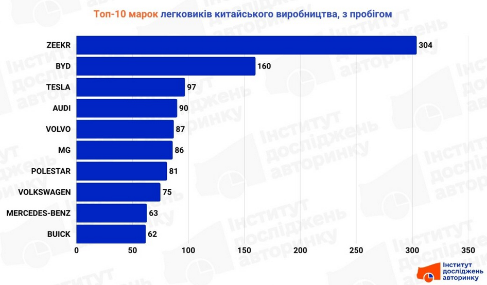 Лідер став бренд Zeekr із результатом 304 реєстрації. Також у топ-10 потрапили BYD, Tesla (зі шанхайського заводу), Audi, Volvo, MG, Polestar, Volkswagen, Mercedes-Benz і Buick. За даними аналітиків, більшість цих авто прибула до України зусиллями незалежних дилерів.