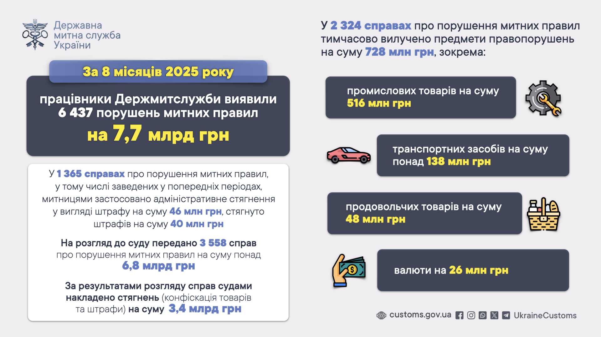 З початку 2025 року митні органи зафіксували 6 437 випадків порушення митних правил, загальна вартість яких становить 7,7 мільярда гривень.