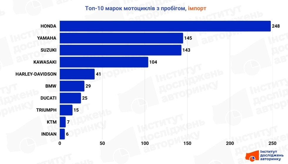 Найбільше ввозять класичних "японців" — Honda, Yamaha, Suzuki та Kawasaki залишаються незмінною четвіркою лідерів, що обирають як новачки, так і досвідчені райдери. Але зростає і частка мотоциклів «з характером»: Harley-Davidson упевнено тримається в середині списку, а Ducati, Indian, KTM і Triumph — нагадують, що для когось мотоцикл це не транспорт, а стиль життя. І попри вік, ці машини приїжджають з амбіціями на нове життя на українських дорогах.