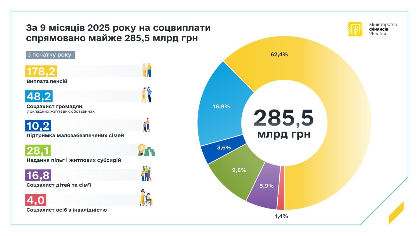 Соціальні виплати у січні – вересні 2025 року були профінансовані вчасно та в повному обсязі. Загалом із державного бюджету на соціальні програми, що реалізуються через Мінсоцполітики, було використано 285,5 мільярда гривень.