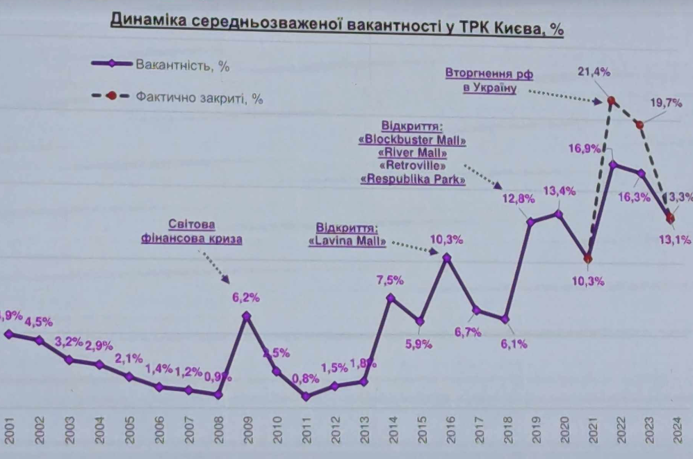 Вакантність площ у торговельних центрах Києва все ще залишається вищою, аніж до війни.