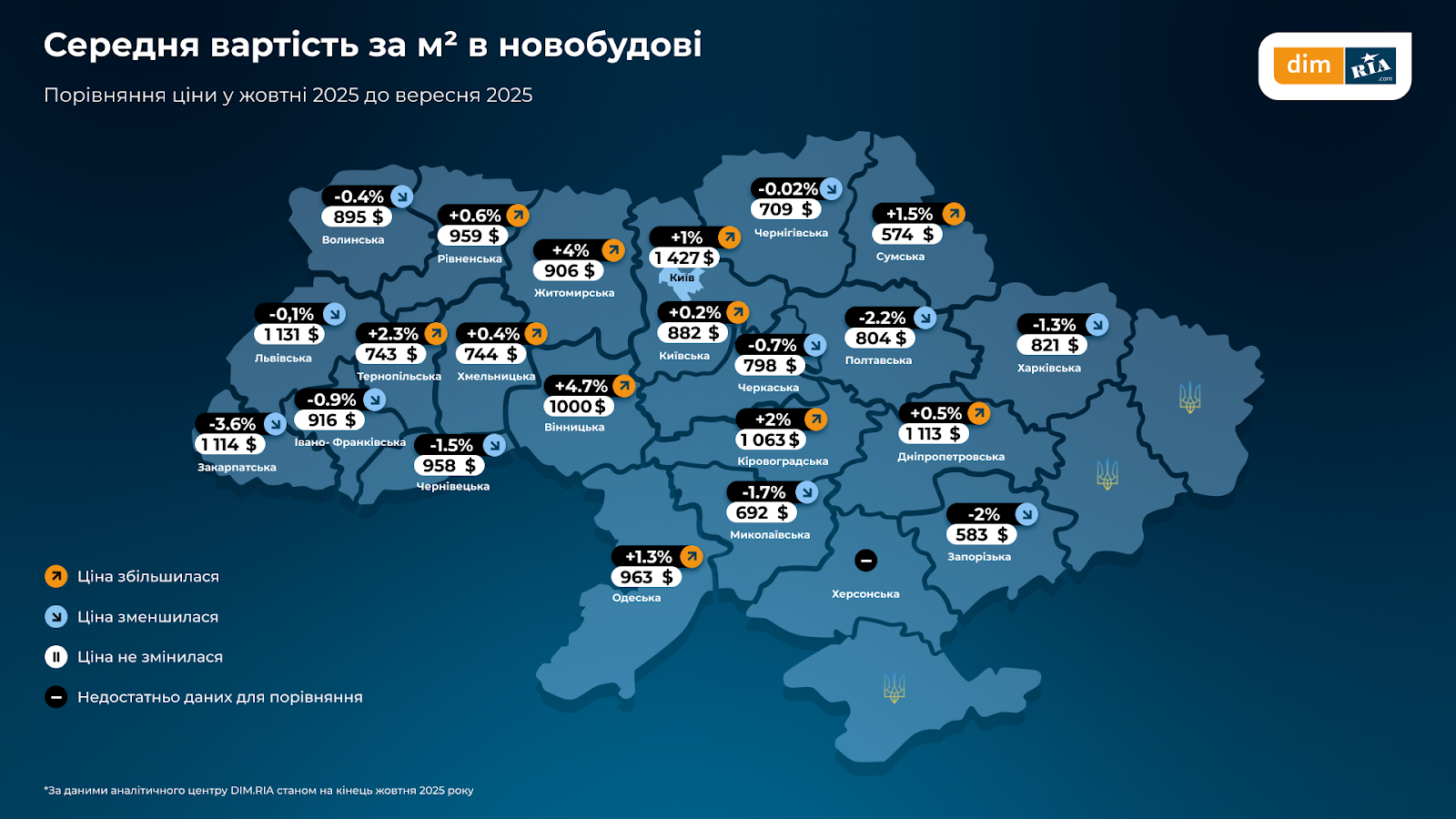 Найдорожчим містом залишається Київ із середньою вартістю квадратного метра в розмірі $1 427/м². Найнижчі ціни — у прифронтових регіонах, зокрема Сумській та Запорізькій областях.