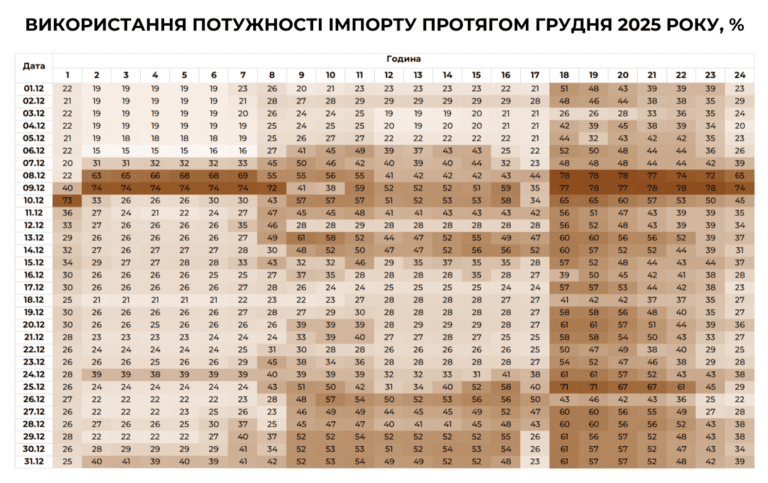 Імпорт протягом місяця залишався стабільно високим і напряму корелював із масованими атаками. Збільшення обсягів постачання зазвичай фіксували вже наступного дня або через день після обстрілів — у період падіння доступної генерації та зростання дефіциту потужності. Зокрема, після атаки 6 грудня імпорт зріс до 21,3 тис. МВт·год 7 грудня та до 32,6 тис. МВт·год 8 грудня, що на 18% і 81% відповідно перевищувало показник дня обстрілу. Подібна динаміка спостерігалася і після ударів 13, 23 та 27 грудня.