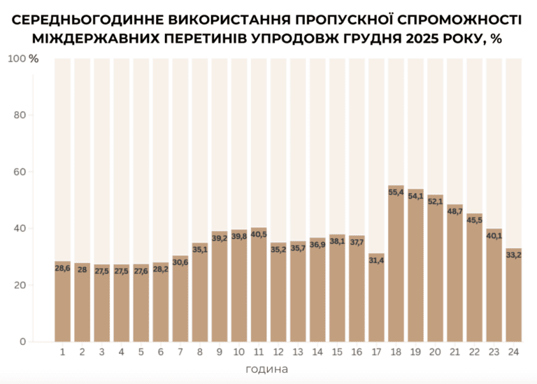 У грудні максимальна пропускна спроможність міждержавних перетинів на імпорт електроенергії зросла з 2,1 ГВт до 2,3 ГВт. У середньому протягом місяця використання доступної пропускної спроможності міждержавних перетинів становило 37,4%. Найнижчі значення фіксувалися в нічні та ранкові години – мінімум 27,5% у період 02:00-04:00. Натомість у вечірні години рівень завантаження суттєво зростав і досягав максимуму 55,4% о 17:00-18:00.