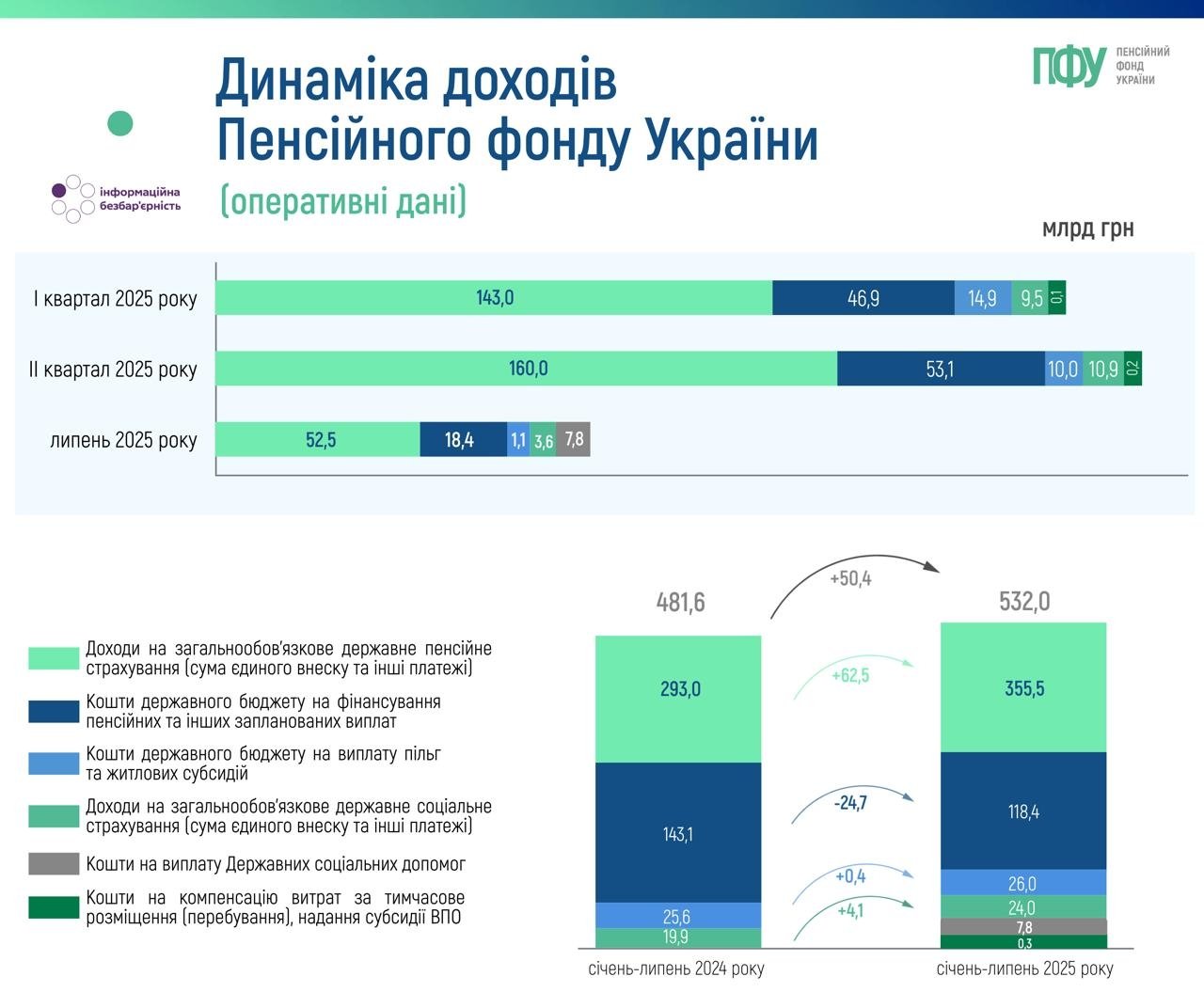 За підсумками січня–липня 2025 року доходи Пенсійного фонду України значно зросли порівняно з аналогічним періодом 2024 року. Загальні надходження фонду за цей період становили 532 млрд грн, що на 50,4 млрд грн, або на 10,5%, більше за показник минулого року (481,6 млрд грн).