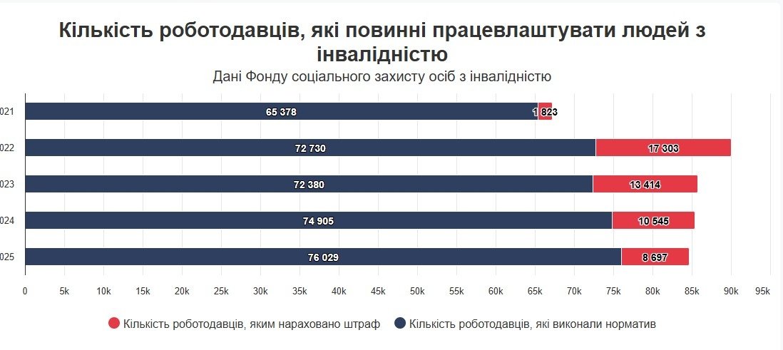 Кількість порушників становить близько 10% від усіх роботодавців, які зобов’язані забезпечувати робочі місця для людей з інвалідністю. Для порівняння, у 2023 році цей показник був значно вищим — 17,5%, а до початку повномасштабної війни — лише 2,5%.