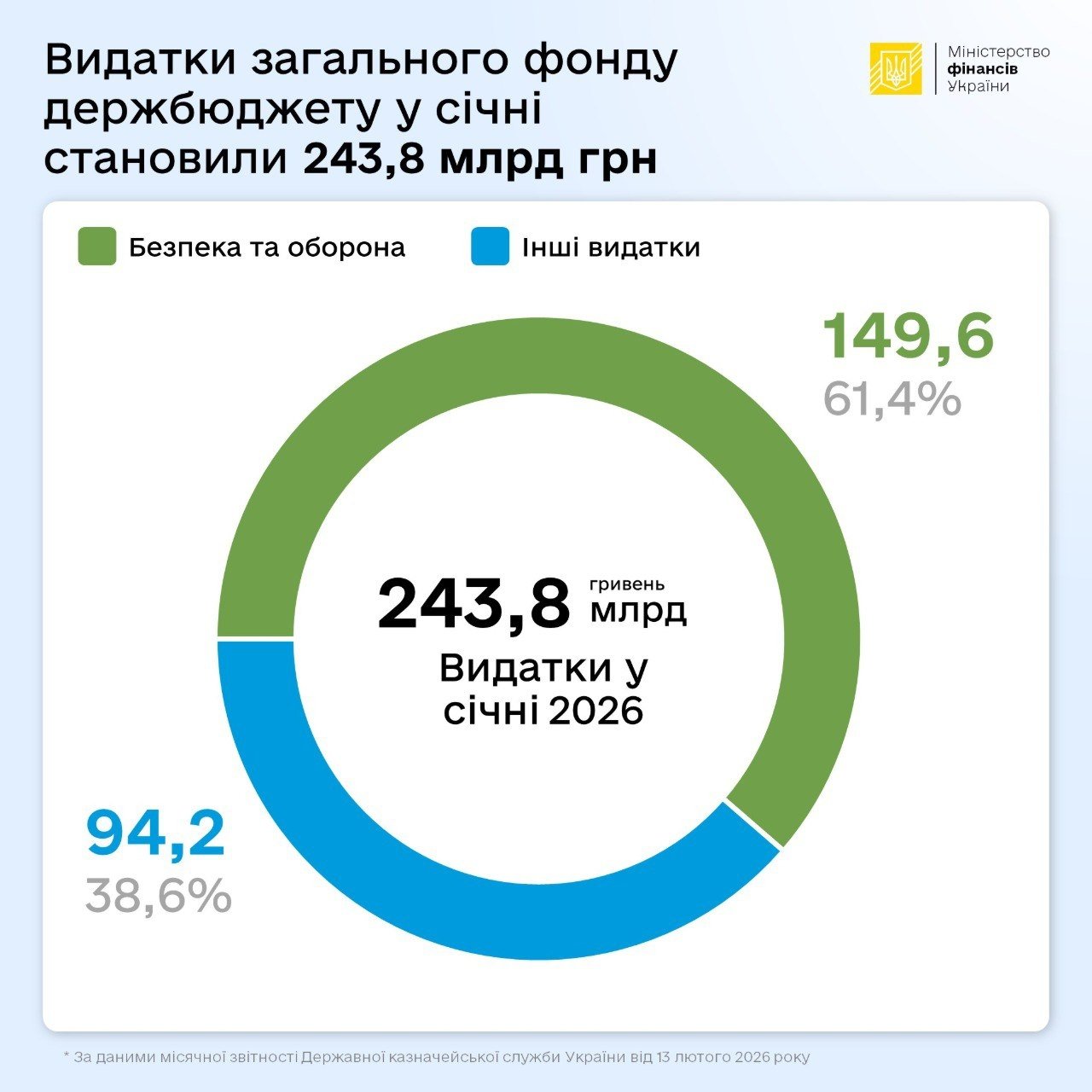 У січні 2026 року касові видатки загального фонду державного бюджету України становили 243,8 млрд грн, що на 13,9% більше, ніж за аналогічний період торік. Із цієї суми 149,6 млрд грн, або 61,4%, спрямували на сектор безпеки й оборони.