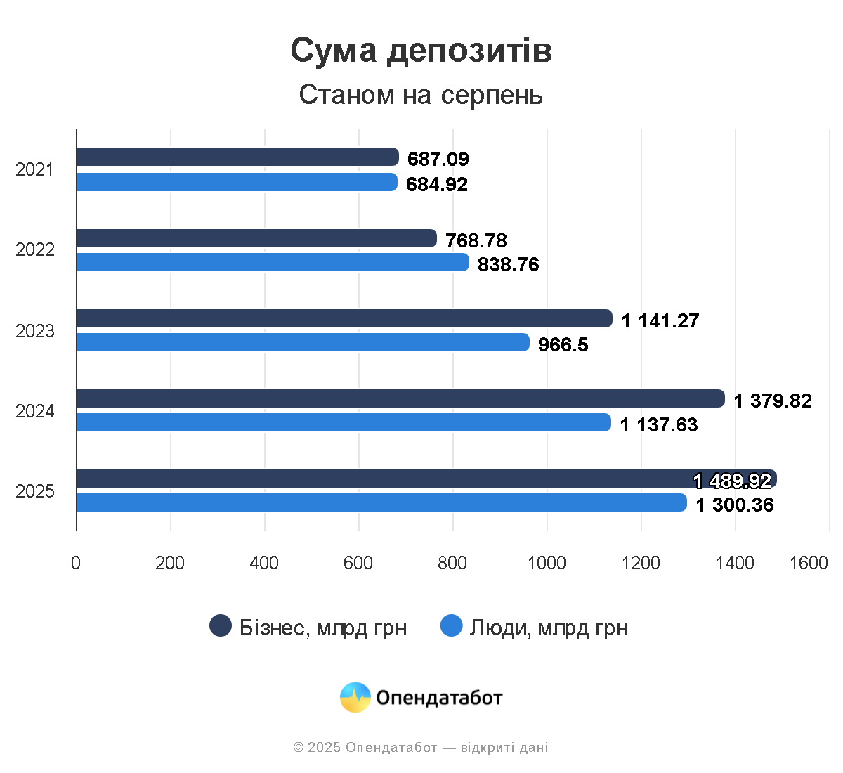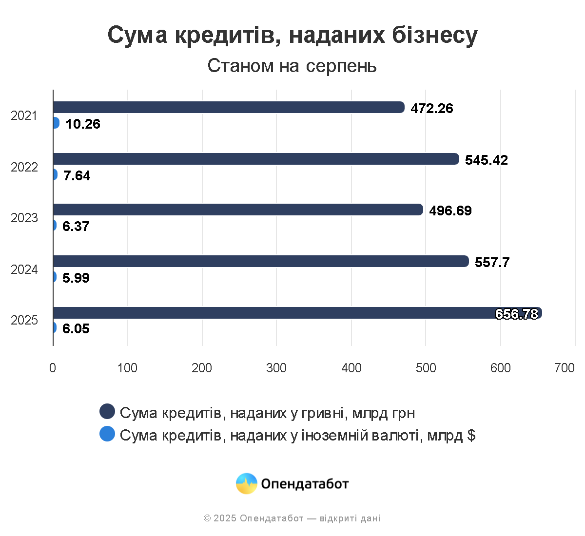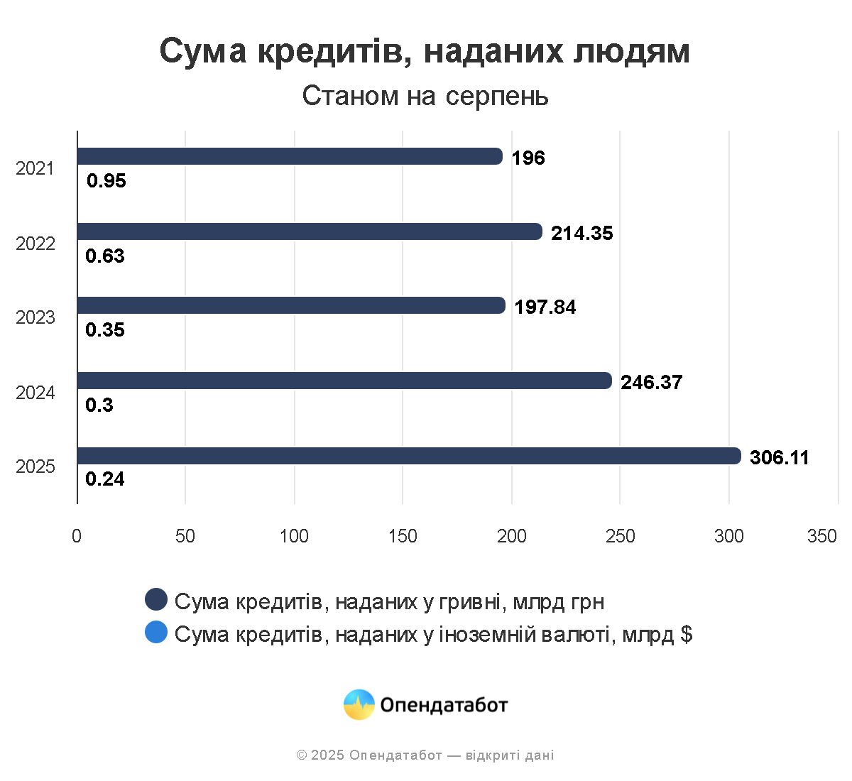 За даними Національного банку України, станом на початок серпня 2025 року 1,23 трлн грн кредитів позичили українці та бізнес. Основні позичальники — бізнес (74%), але найшвидше зростають кредити людей (+22% за рік). Водночас сума депозитів у 2,3 раза більша за суму кредитів. Понад третину цих депозитів — у валюті.