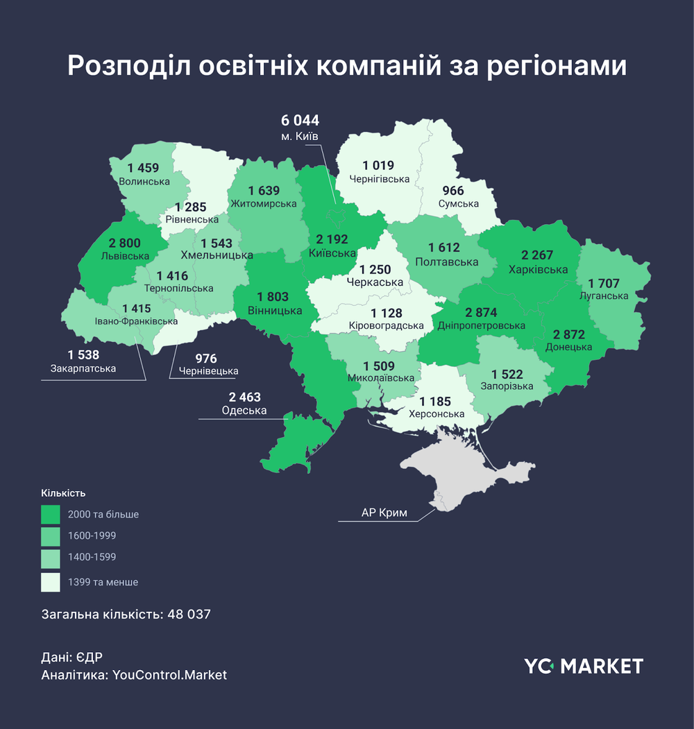 Регіональна картина ринку залишається сконцентрованою в містах і відносно безпечних регіонах. Столиця впевнено лідирує — близько 6 тисяч навчальних закладів, що становить близько 12–13% від загальної кількості. Далі йдуть Дніпропетровська область (приблизно 2,9 тис.), Львівська (приблизно 2,8 тис.), Одеська (приблизно 2,5 тис.) і Харківська (приблизно 2,3 тис.).