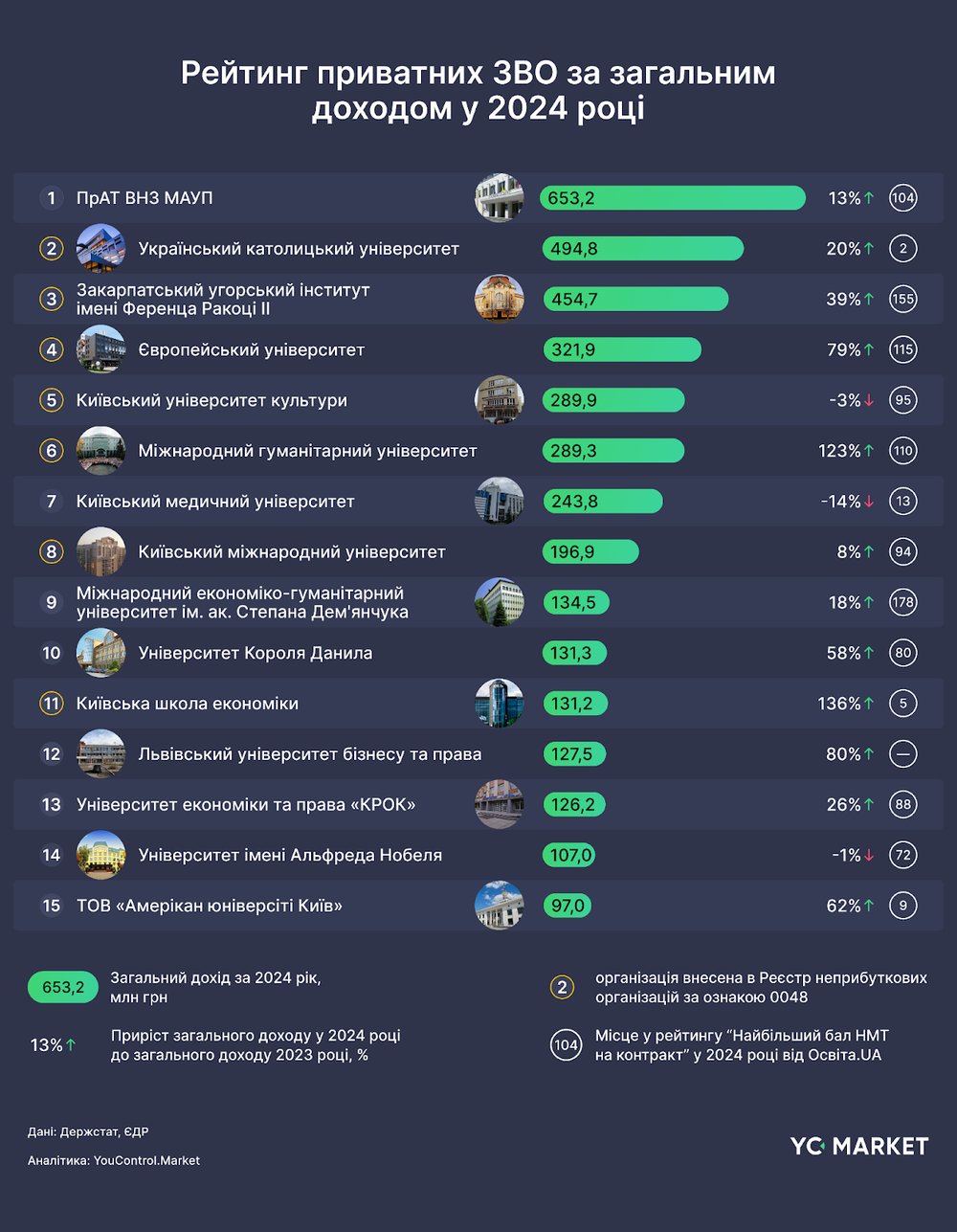 Очолює рейтинг Міжрегіональна академія управління персоналом (МАУП, Київ) із 653,2 млн грн доходу у 2024 році; на другому місці — Український католицький університет (УКУ, Львів) із 494,8 млн грн, на третьому — Закарпатський угорський інститут ім. Ф. Ракоці II (Берегове) з 454,7 млн грн.