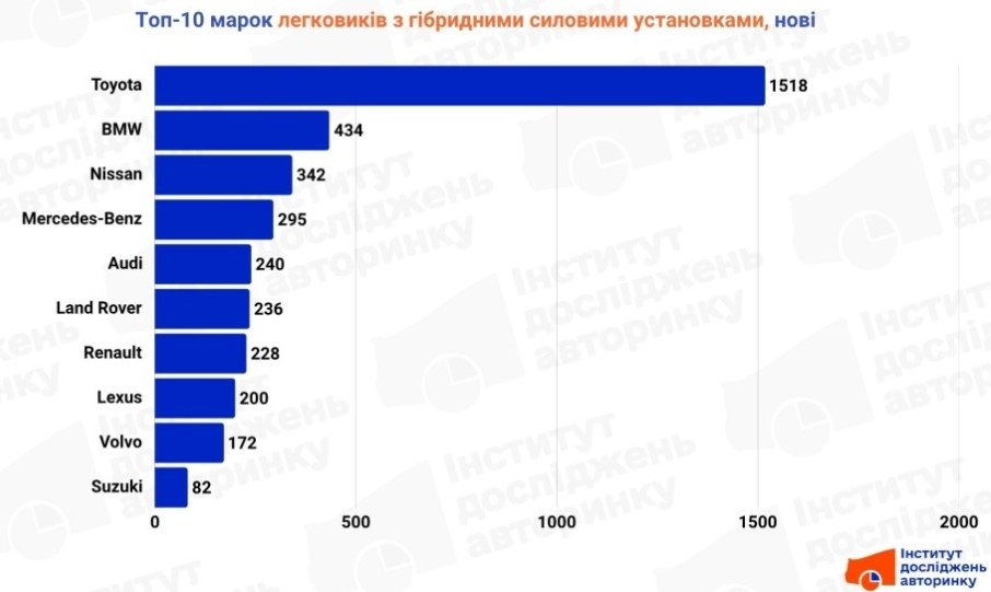 До топ-10 також входять бренди, які активно розвивають плагін-гібриди (PHEV) і м’які гібриди (MHEV) — Audi, Land Rover, Lexus, Volvo. Нові гібриди купують не лише для економії палива, а й за технологічність, потужність та зниження викидів. Renault та Suzuki забезпечують доступні рішення для масового сегмента.