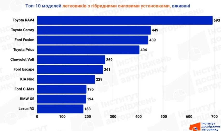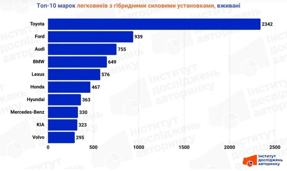 У третьому кварталі ринок вживаних гібридних автомобілів в Україні підтвердив лідерство Toyota, яка завдяки широкому асортименту моделей і першості у розвитку гібридних технологій впевнено випереджає конкурентів. Друге місце займає Ford, популярність якого зумовлена активним імпортом моделей з США.