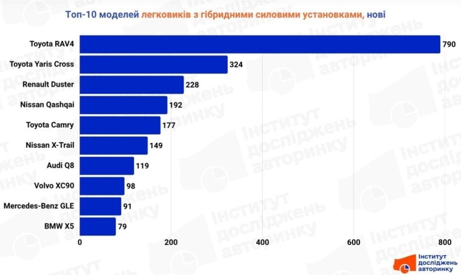 Також високий попит мають гібридні кросовери Nissan Qashqai, X-Trail та доступний Renault Duster. Преміум-сегмент представляють Audi Q8, Volvo XC90, Mercedes-Benz GLE і BMW X5, демонструючи, що гібридні технології стали стандартом для верхнього класу.