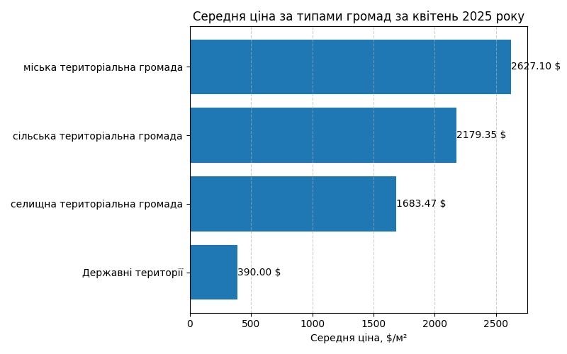 Дані за типами територіальних громад демонструють, що найбільша вартість ділянок зосереджена в міських громадах – переважно навколо обласних центрів і великих міст. Середня ціна в міських громадах у квітні 2025 року становила близько $2 627/ар, тоді як у селищних громадах – близько $1 684/ар, а в сільських – $2 179/ар.