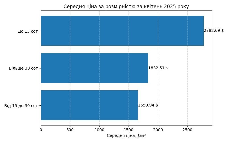 Зокрема у квітні 2025 р. дрібні лоти (≤15 соток) мали вищу ціну за сотку ($2 783) порівняно з великими ділянками (>30 соток, $1 833/ар).