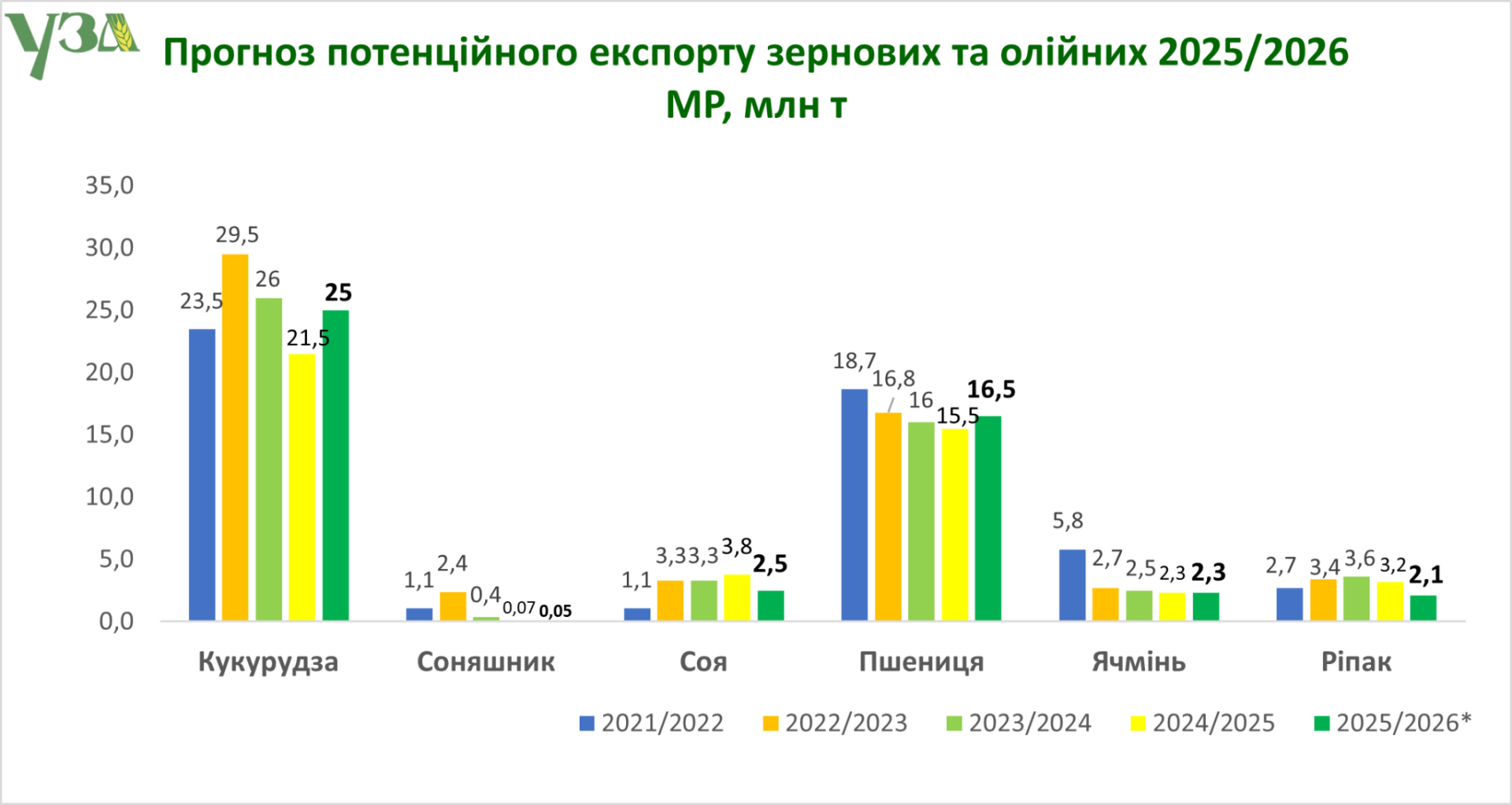 Врожай пшениці в 2025 році УЗА оцінює на рівні 22,5 млн. т. (в 2024 – 22,4 млн т). Потенційний експорт пшениці в 2025/2026 маркетинговому році, який розпочався 1 липня 2925 року, міг би сягнути 16,5 млн т.