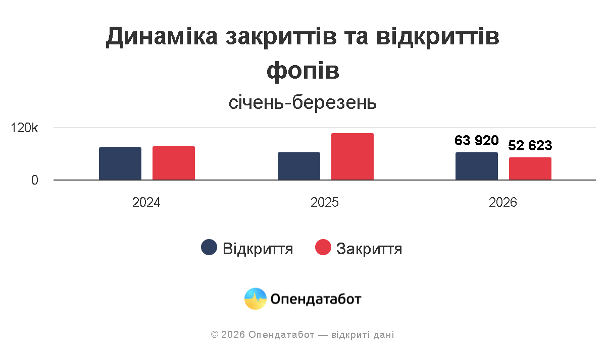 Зазначається, що за перший квартал 2026 року загалом 63 920 підприємців відкрили свою справу, а 52 623 ФОПи припинили свою діяльність.
