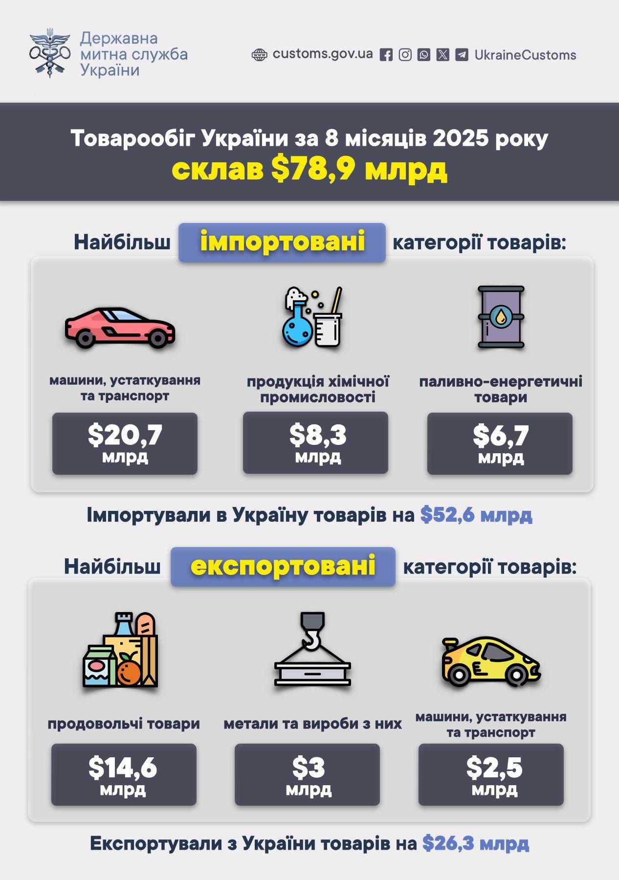 За вісім місяців 2025 року товарообіг України становить $78,9 млрд. Імпорт товарів до країни досяг $52,6 млрд, тоді як експорт становив $26,3 млрд.