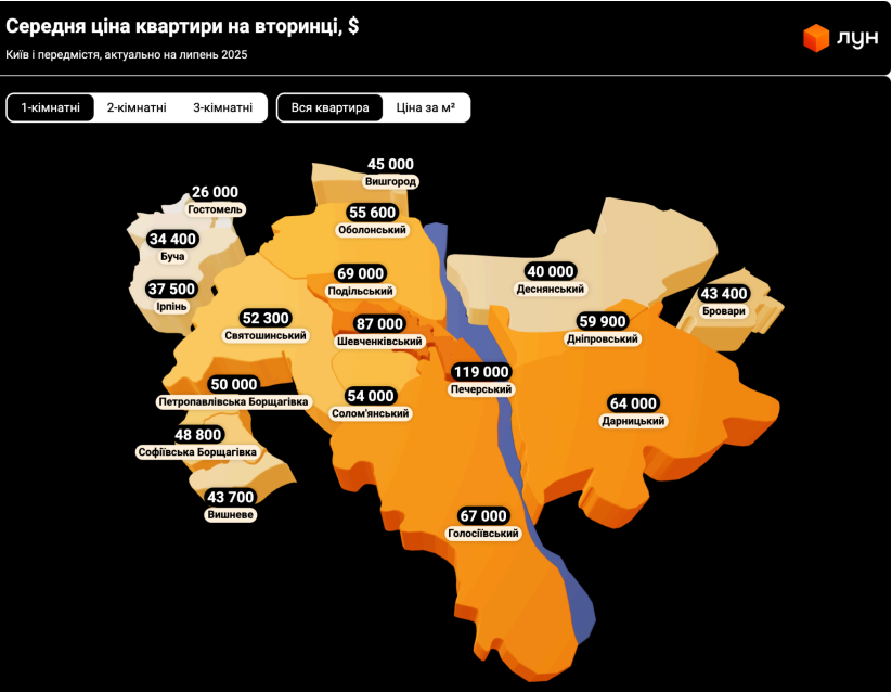 Загалом за даними ЛУН, на початку липня на столичному вторинному ринку було виставлено на продаж майже 16 тисяч квартир. Лідером за пропозицією є Печерський район, де продавці пропонують близько 2,4 тис. об'єктів. Дарницький район посідає друге місце з 2,2 тис. варіантів, а Голосіївський — третє (1,9 тис. лотів).