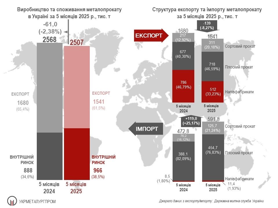 За перші п’ять місяців 2025 року українські металургійні підприємства виробили 2,057 млн тонн металопрокату — це 97,6% від обсягів аналогічного періоду 2024 року. З усього обсягу продукції 61,5% було експортовано (1,541 млн тонн), тоді як минулого року частка експорту становила 65,4%.