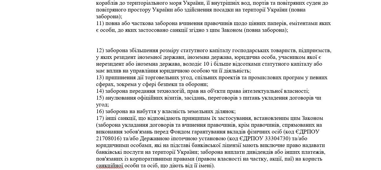 Санкції включають блокування активів, припинення торговельних операцій, обмеження виведення капіталів, зупинення економічних зобов'язань, обмеження участі у приватизації, заборону здійснення публічних закупівель, обмеження статутного капіталу, заборону на укладання будь-яких договорів, а також правочинів щодо цінних паперів, заборону виплати дивідендів та інших платежів на користь санкційної особи.