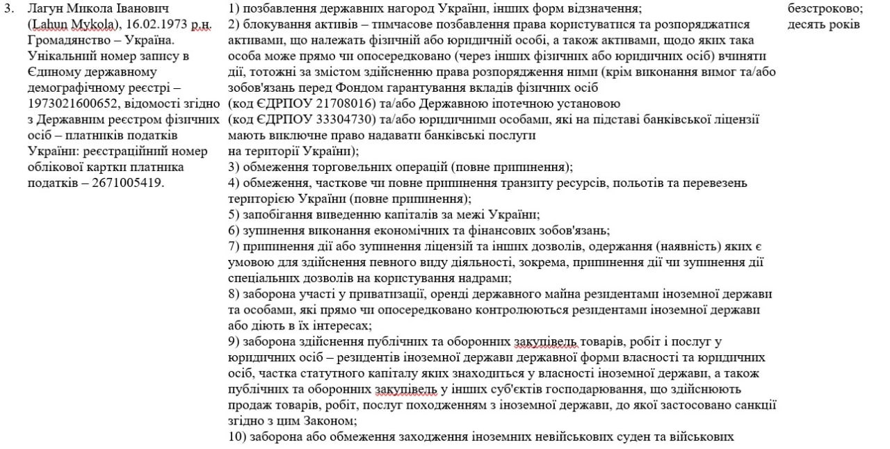 У додатку до указу президента№694/2025 зазначається, що до санкційного списку потрапив також Микола Лагун - колишній власник збанкрутілого Дельта Банку.