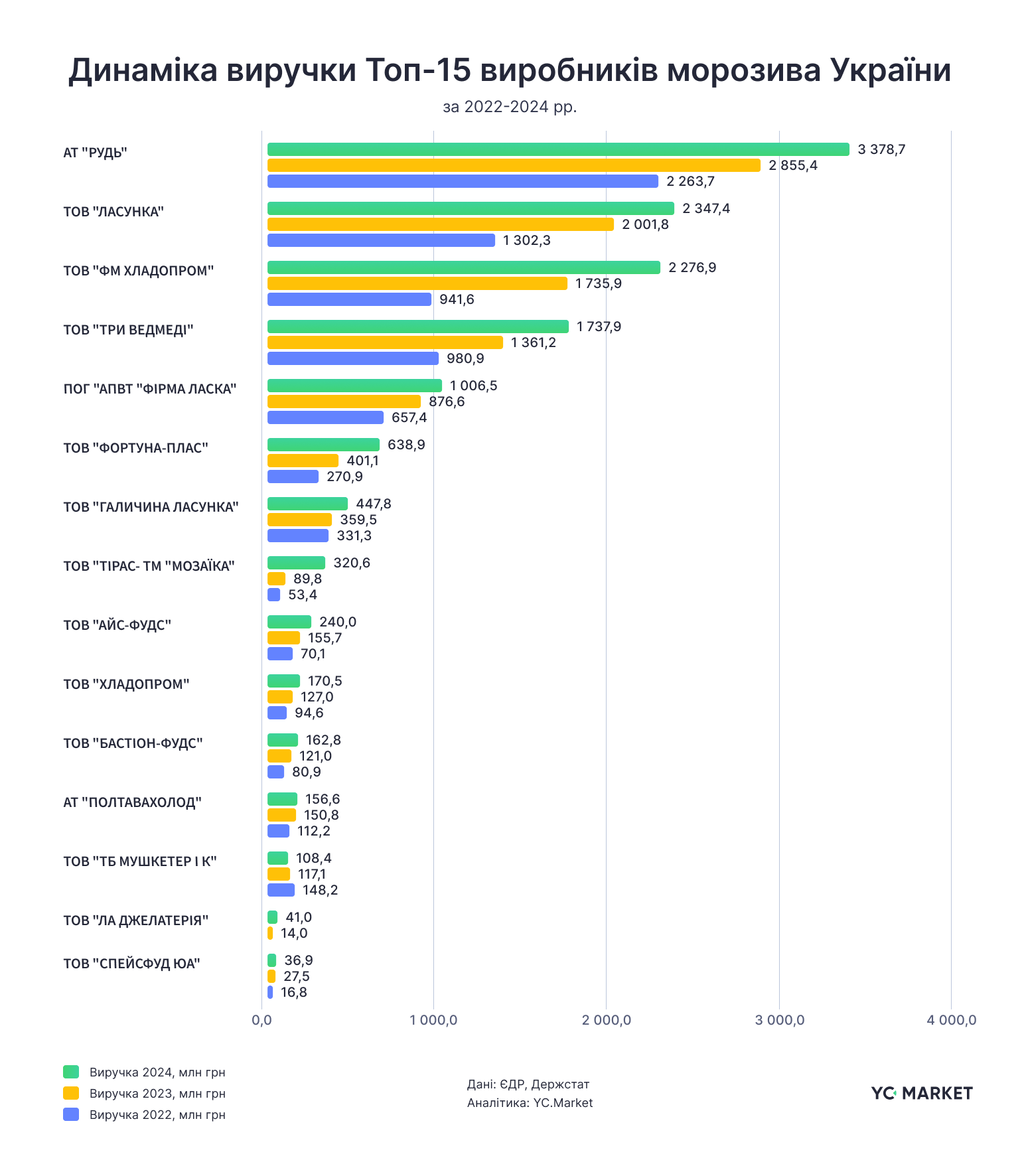 Сукупна виручка юридичних осіб, які оприлюднили звітність за 2024 рік, склала 13,3 млрд грн — на 21% більше, ніж у 2023 році (10,5 млрд грн) та на 44% більше, ніж у 2022 році (7,5 млрд грн). Найпомітніше зростання продемонструвало ТОВ "Тірас – ТМ "Мозаїка", яке збільшило свою виручку більш ніж утричі — до 320 млн грн. Компанія виготовляє морозиво як під власною ТМ, так і під ТМ "Рудь", а її бенефіціар — громадянин США Артур Бурбуряк.