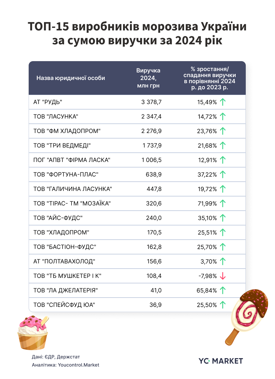 Лідером виступає АТ "Рудь", яке за підсумками 2024 року отримало виручку в розмірі 3,4 млрд грн — 26% загального ринку. Компанія є частиною корпоративної групи "Рудь", кінцевими бенефіціарами якої є депутат Житомирської облради Петро Рудь та його донька Оксана Вівсик, яка очолює наглядову раду підприємства. Окрім морозива, компанія також виготовляє заморожені фрукти, овочі, молочну продукцію та напівфабрикати.