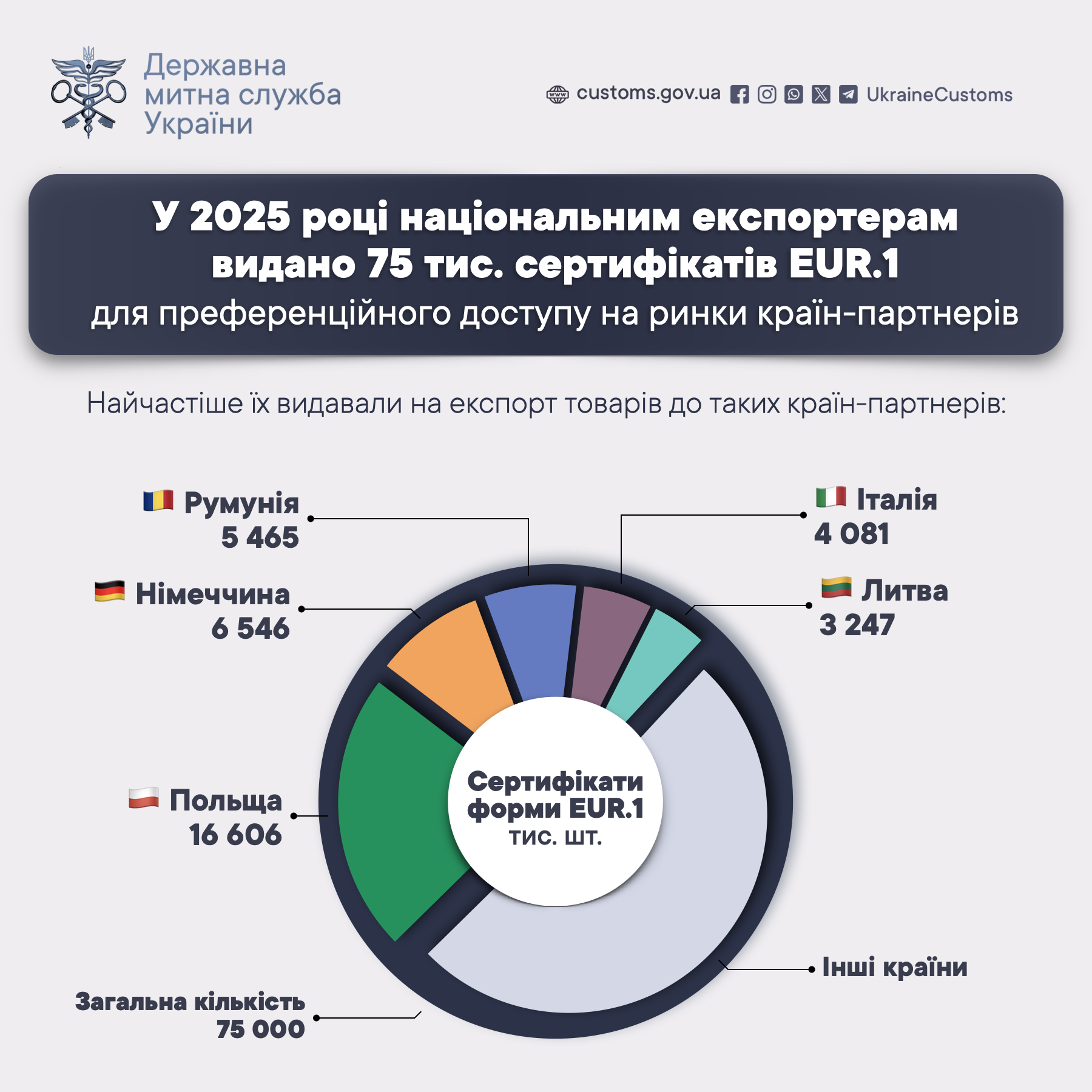 З початку року національним експортерам видано 75 тисяч сертифікатів EUR.1 для преференційного доступу на ринки країн-партнерів. Найбільше товарів за таким документом було направлено до Польщі, Німеччини та Румунії.