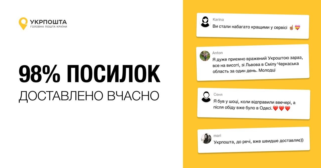 У травні 2025 року "Укрпошта" продемонструвала один із найкращих результатів у своїй історії — 98% усіх посилок було доставлено вчасно. Це надзвичайно високий показник, який відповідає світовим стандартам лідерів ринку, таких як FedEx і UPS, що підтримують рівень своєчасної доставки на рівні 95–97%.