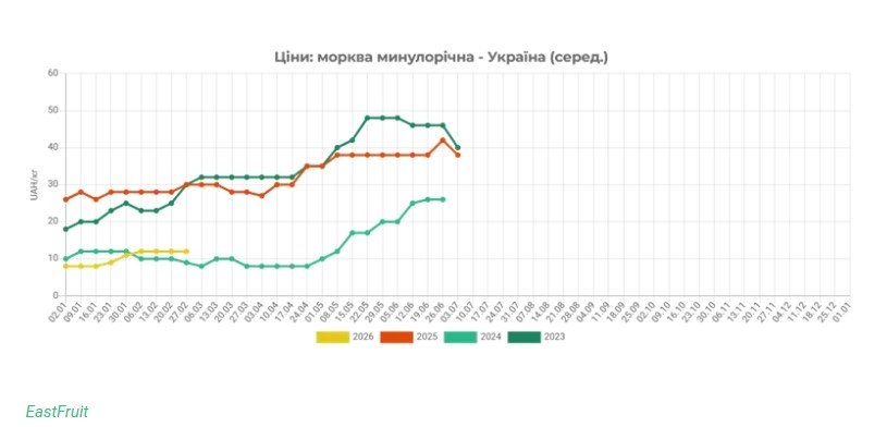 Аналітики також зазначають, що нинішні ціни на моркву в Україні вже в середньому на 64% нижчі, ніж на початку березня 2025 року. При цьому учасники ринку не виключають подальшої стагнації в цьому сегменті через досить низьку торговельну активність.