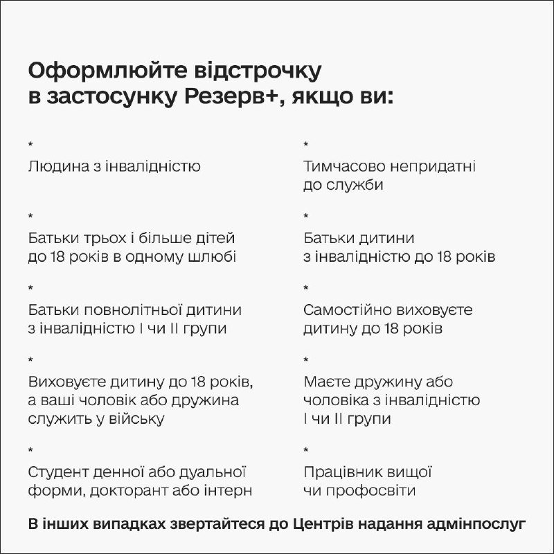 Громадяни, які не користуються смартфоном або чий тип відстрочки ще не підтримується в "Резерв+", можуть подати заяву у ЦНАПі. Адміністратор внесе дані до електронної системи через портал "Дія"та передасть заяву до відповідного ТЦК.