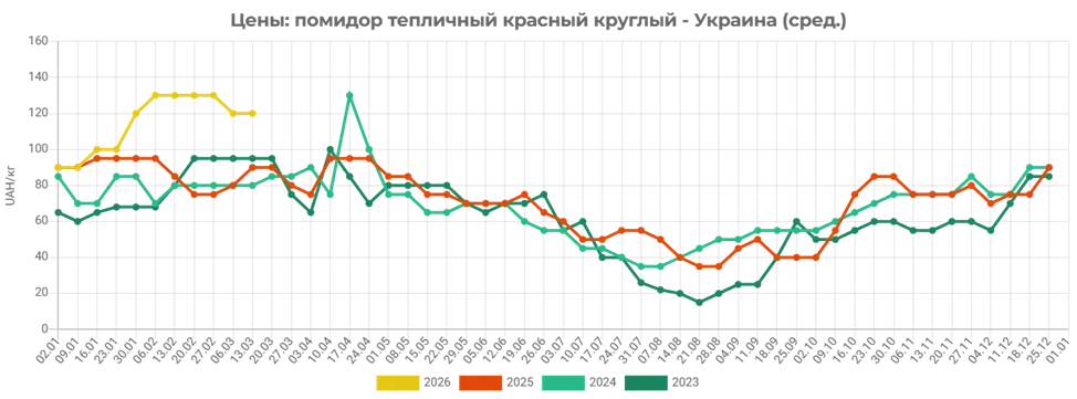 Внаслідок цього до кінця поточного тижня ціни на помідори в Україні становлять 120–140 грн/кг ($2,73–3,19/кг), що в середньому на 10% вище, ніж наприкінці попереднього звітного періоду.