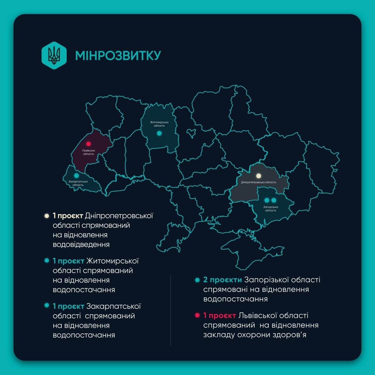 - 4 проєкти з відновлення закладів охорони здоров’я.
