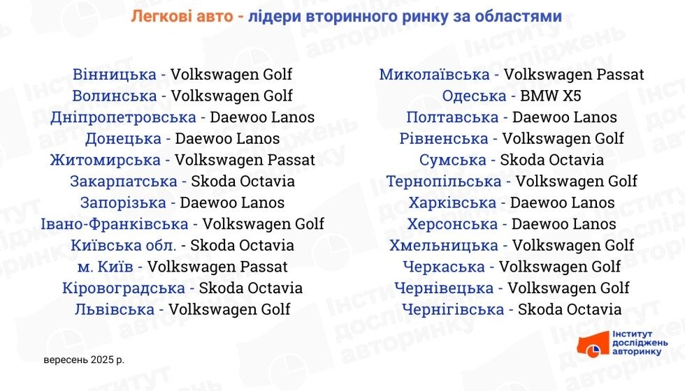 У вересні 2025 року український вторинний авторинок продемонстрував стійку прихильність до "класики". Серед найпопулярніших вживаних авто — Volkswagen Golf, Skoda Octavia, Daewoo Lanos та Volkswagen Passat.